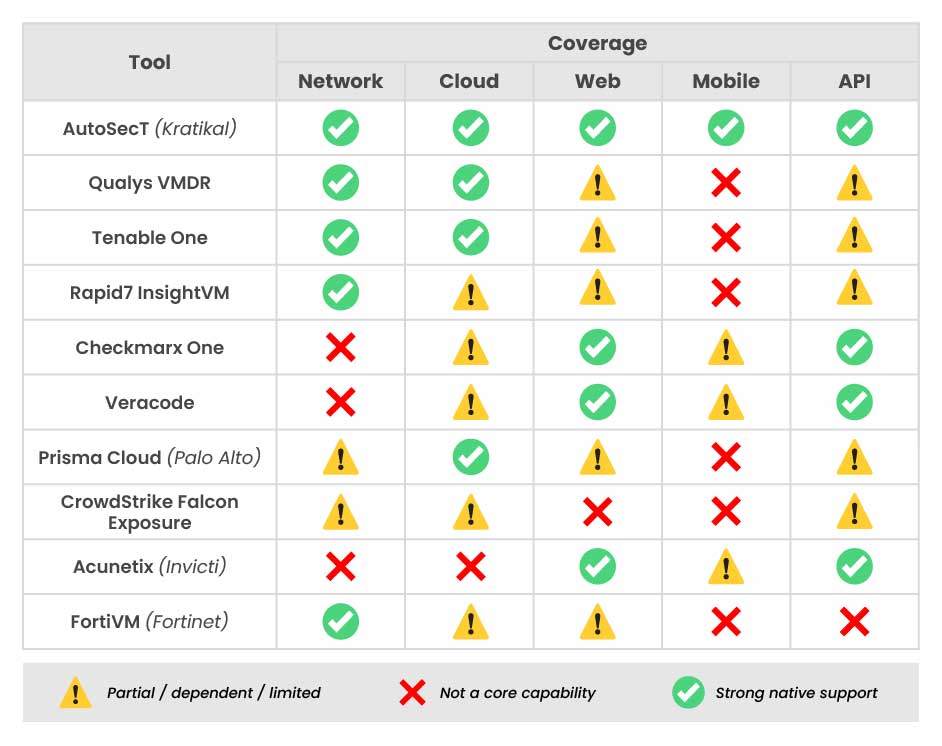 AutoSecT (Kratikal)Organizations wanting accuracy, near-zero false positives, and effective AI-powered remediation focusNewer brand vs legacy giants