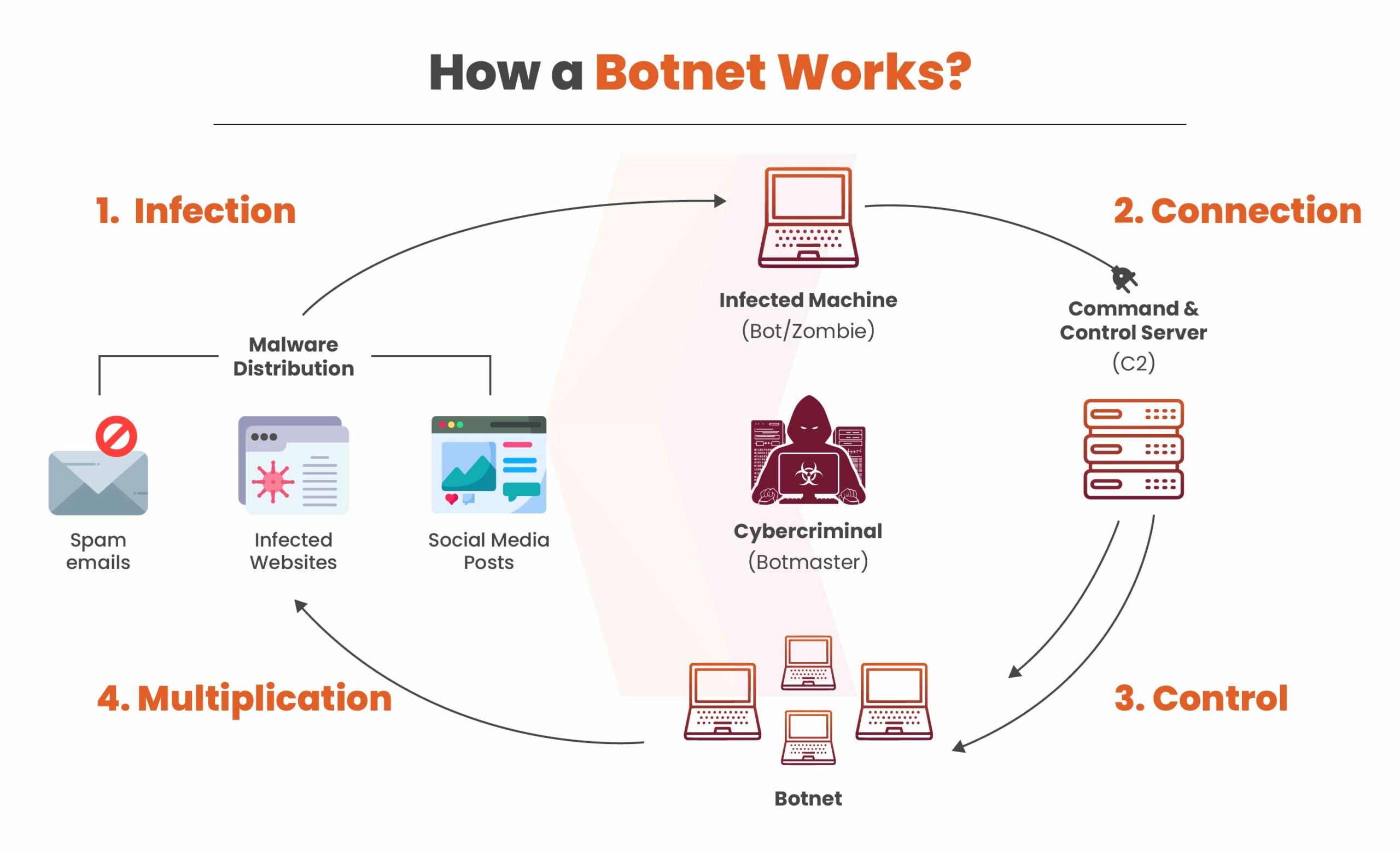 This process consists of several stages. When utilized to their full capacity, botnets can execute large-scale attacks. Hackers often need to support a botnet with additional machinery or devices to enhance its capabilities. To gain a deeper understanding of how botnets operate, it’s essential to familiarize oneself with key terminologies.