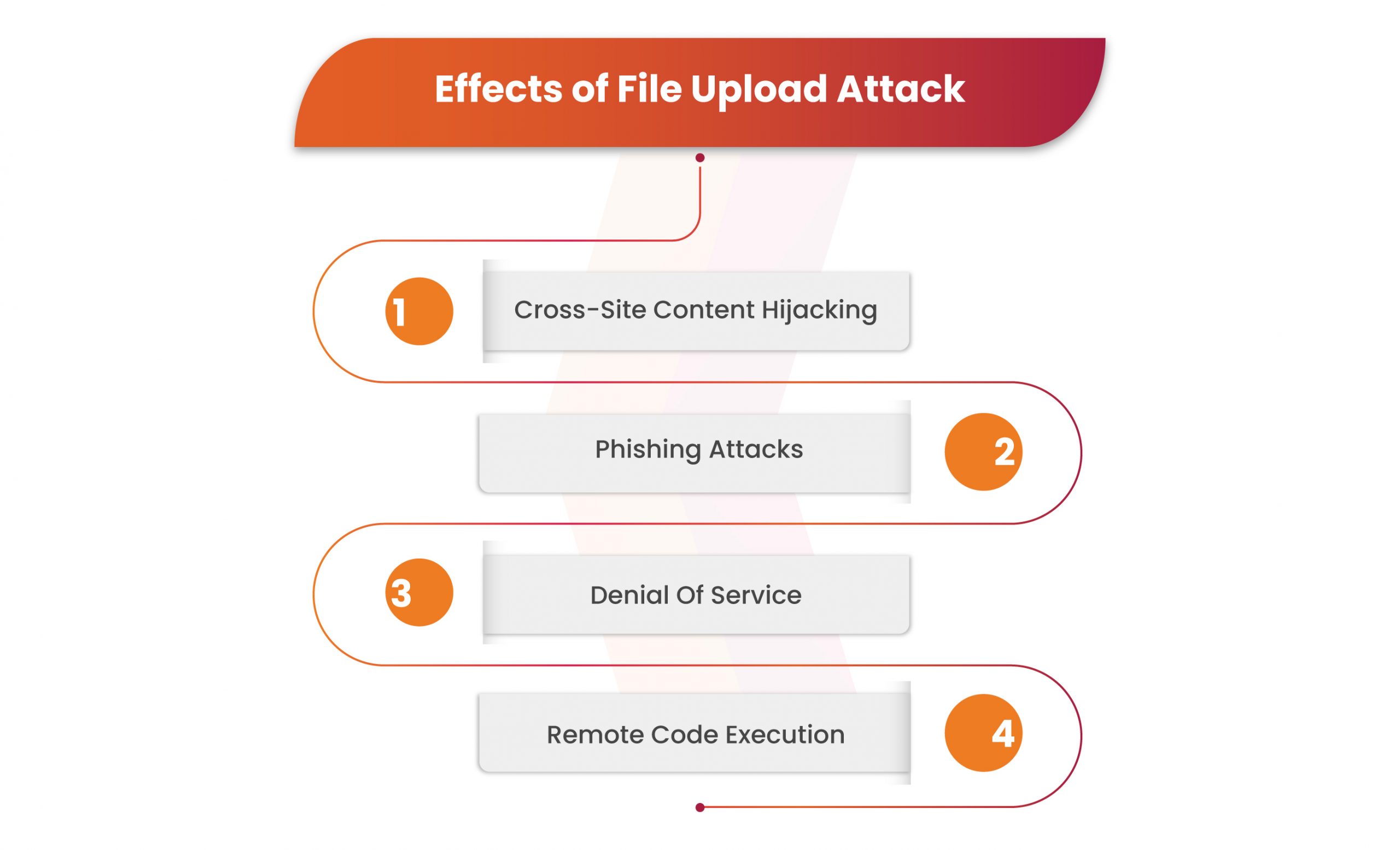 A file upload vulnerability is a popular target for hackers due to its simplicity of use and potential for different malicious actions. Effects of file upload attack include: