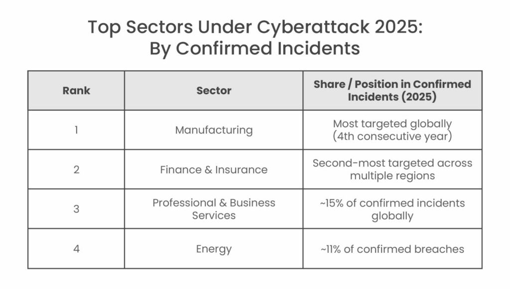In 2025, the most targeted sectors include education (highest attack volume), manufacturing (most confirmed breaches for the 4th year), finance & insurance, government/public sector, healthcare, and energy & utilities.