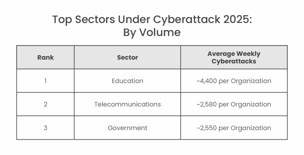 Educational institutions, including schools, universities, and research organizations, have emerged as a top target, experiencing the highest volume of attacks of any sector in 2025. Check Point data shows education faced an average of 4,400+ attacks per week per organization, more than double the global average. This made education the #1 most-attacked sector by volume of attempts.