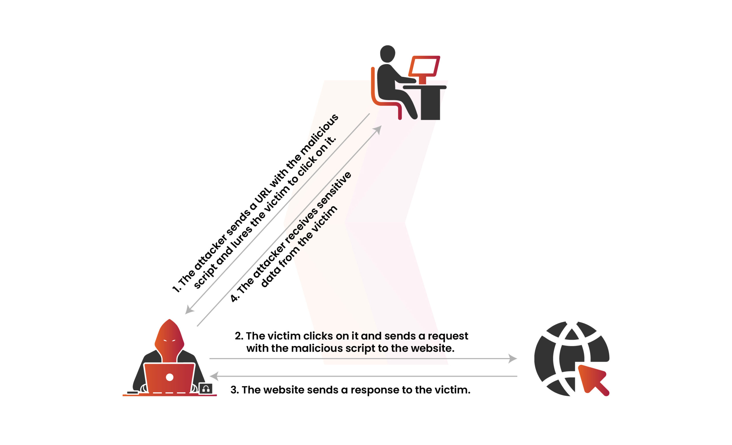 When input must be provided each time for execution, it is known as reflected XSS. These attacks typically involve sending a payload directly to the victim. The victim then makes a request with the payload, which is embedded in the response as a script. An example of reflected XSS is when a payload is injected through a search field.