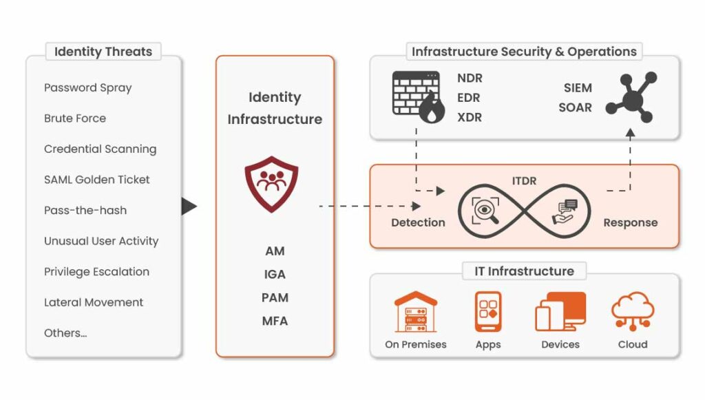 Attackers target identities using techniques like password spraying, credential abuse, and privilege escalation. ITDR monitors identity systems such as IAM, PAM, MFA, and IGA. It correlates this data with signals from EDR, NDR, SIEM, and SOAR. ITDR detects abnormal identity behavior and triggers response actions. This helps protect on-premises systems, cloud environments, applications, and devices.